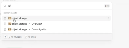 Type "R2" in the search box and select "R2 Object Storage" from the results required to open the R2 management UI.