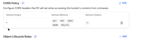 Before using the file upload features of the application, you must configure the CORS rules for your Cloudflare R2 bucket. This enables your browser to upload files directly to the storage bucket securely.