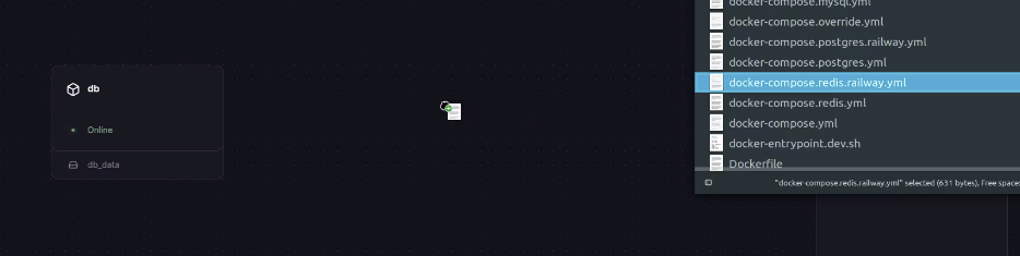 Once the db service gets deployed, go ahead and drag and drop the next file docker-compose.redis.railway.yml to create the redis service.