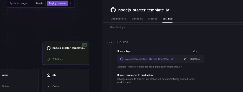You should notice that the Node.js app (from github repo) is now connected to the other "db" and "redis" services.