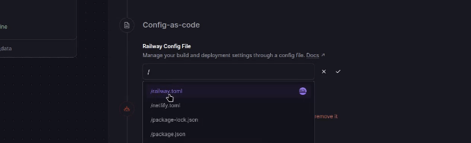 At the very bottom you will find a section named "Config-as-code". In the Railway config file input choose railway.toml