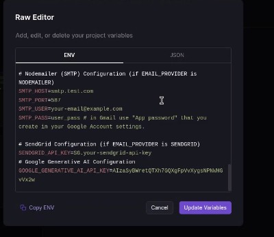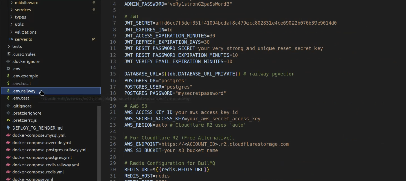 Open the nodejs project on VSCode and open the .env.railway file. Copy its entire content and paste it inside the "Raw editor" on Railway.