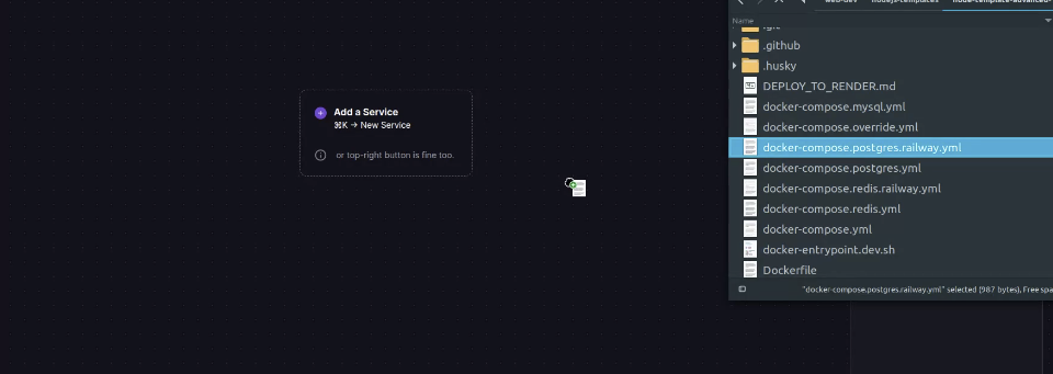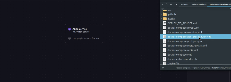 Open the project in the browser folder and drag and drop the docker-compose-postgres.railway.yml file. This will create a new "db" service.