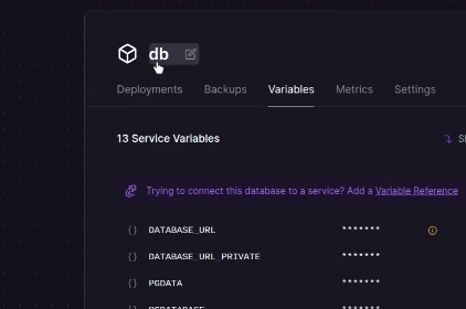 Keep all the variables values that look like this ${{db.DATABASE_URL_PRIVATE}} or ${{redis.VARIABLE}} (you may want to change the demo variable to false).